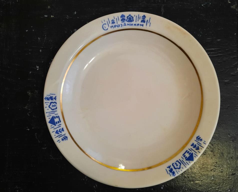 Описание предмета и его основных частей: Тарелка маленькая, плоская из фаянса. По бокам рисунки и надпись "С праздником". На дне с обратной стороны штамп "Хайта". По тулову золотистая полоска, ц. 55 к.,