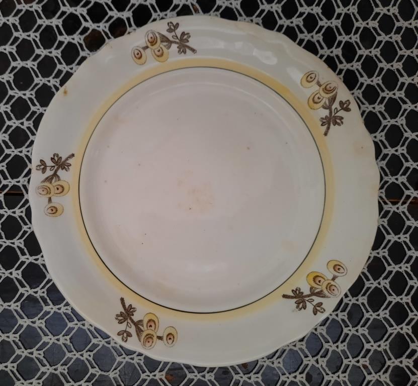 Описание предмета и его основных частей: Тарелка маленькая, плоская. По краю тулова растительный орнамент и желтая полоса. На дне штамп "З и К Конаково"