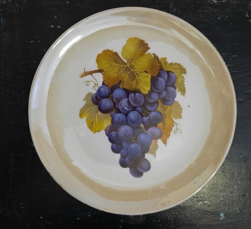 Описание предмета и его основных частей: Тарелка маленькая, плоская, декоративная, глазированная. На дне имеется рисунок -гроздь синего винограда