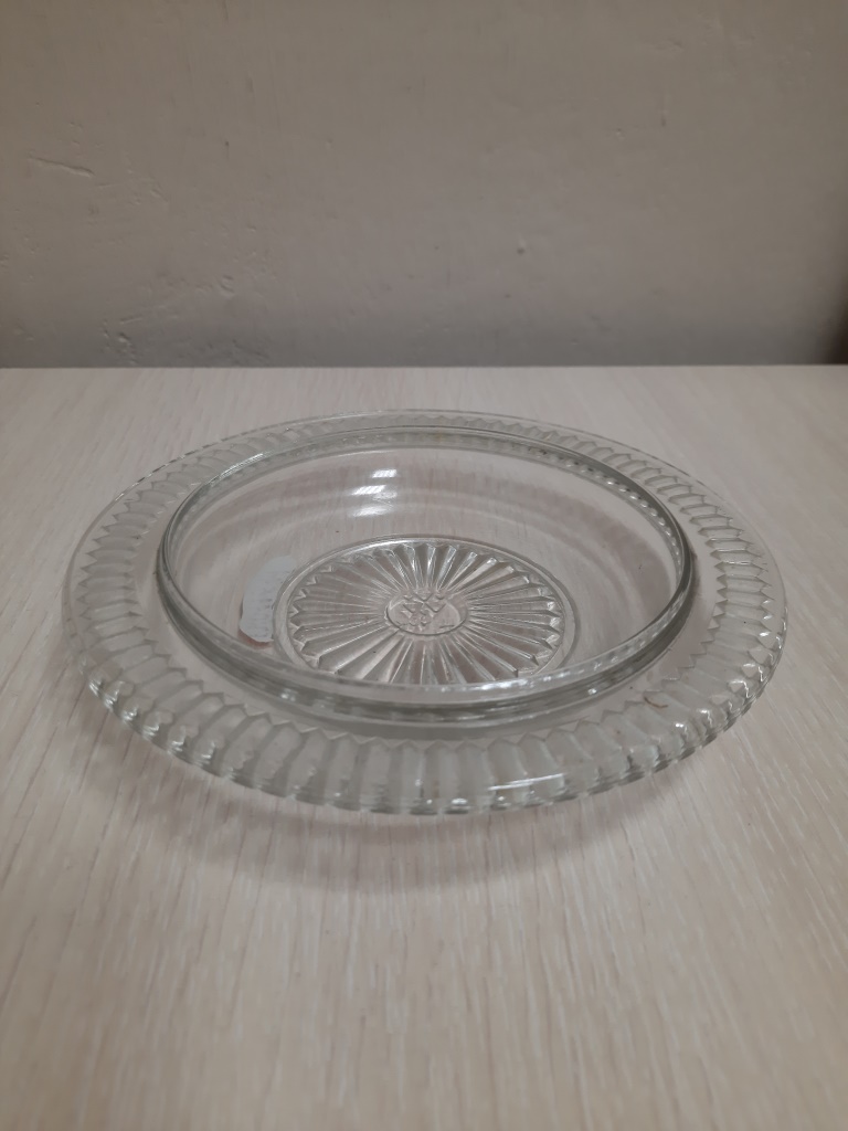Описание предмета и его основных частей: Масленка стеклянная, круглой формы, рифленая юбочка, по дну рифленый рисунок